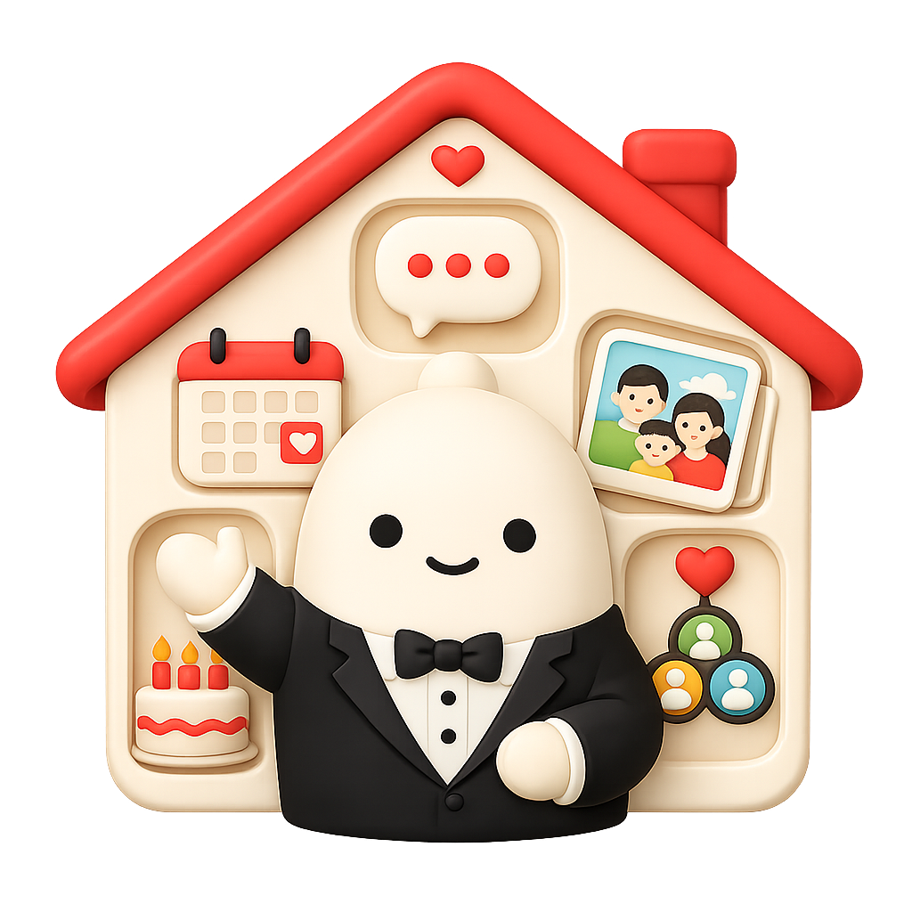 Jipsa House brings family chats, photo albums, schedules, and birthdays into one app. A butler can answer from family context when needed, while QR invites make it easy to connect family members.